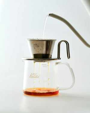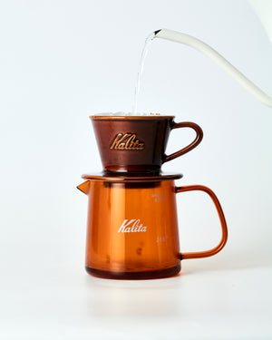 The Kalita Jug 400 is available in two color options: a warm amber that adds a sense of softness, and a clear version that is minimal yet visually striking.